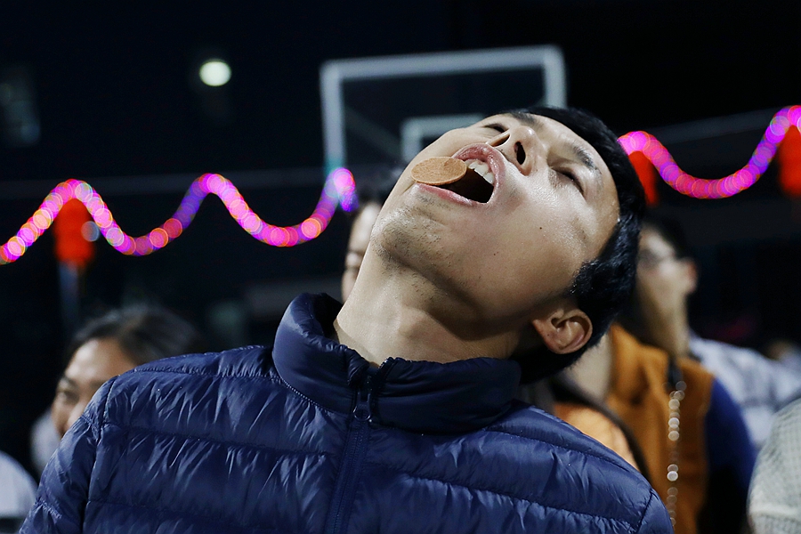 第二個游戲環(huán)節(jié)是“擠眉弄眼”。這個游戲的規(guī)則是頭朝上,額頭放置山楂片一塊,然后選手運用自己的臉部的五官靠肌肉扭動把山楂片從額頭移到嘴里,是一個既好玩又好吃的游戲,最后由風控中心/管理中心/市場中心組成的群英隊獲得了“擠眉弄眼”的冠軍。