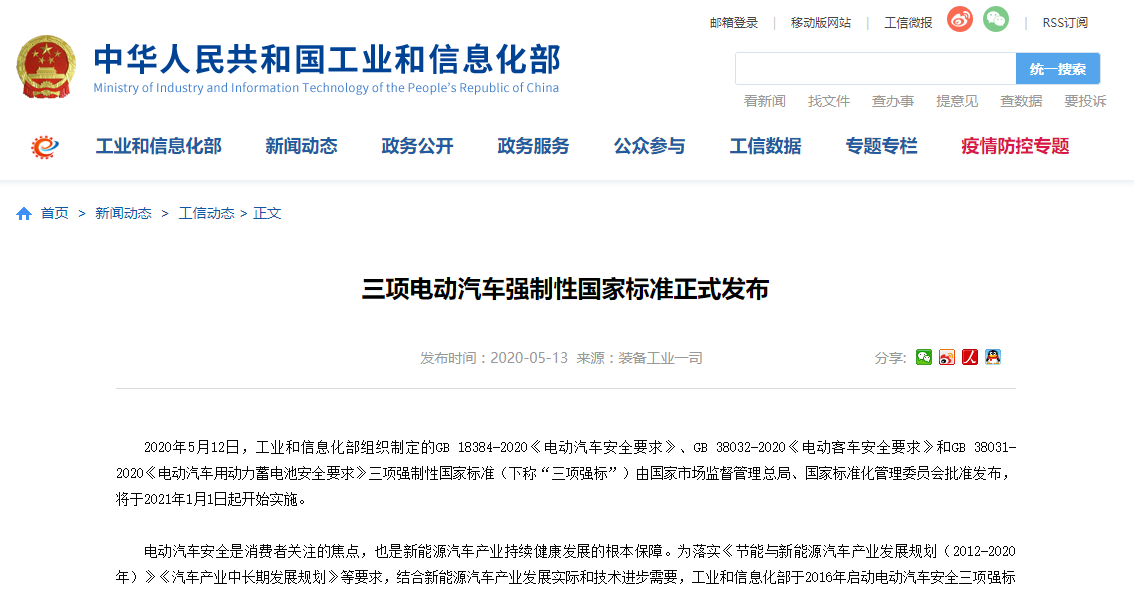 2020年5月12日,工業(yè)和信息化部組織制定的GB 18384-2020《電動汽車安全要求》、GB 38032-2020《電動客車安全要求》和GB 38031-2020《電動汽車用動力蓄電池安全要求》三項強制性國家標準由國家市場監(jiān)督管理總局、國家標準化管理委員會批準發(fā)布,進一步提高和優(yōu)化了對電動汽車整車和動力電池產(chǎn)品的安全技術(shù)要求。
